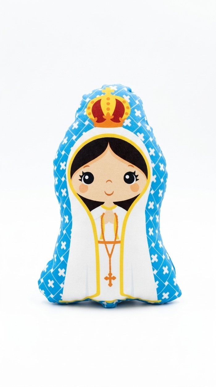 Almohada decorativa de diseño religioso en tonos azules, con ilustración tipo caricatura que transmite ternura y dulzura. Perfecta como detalle decorativo, recuerdo especial o regalo para celebraciones religiosas.