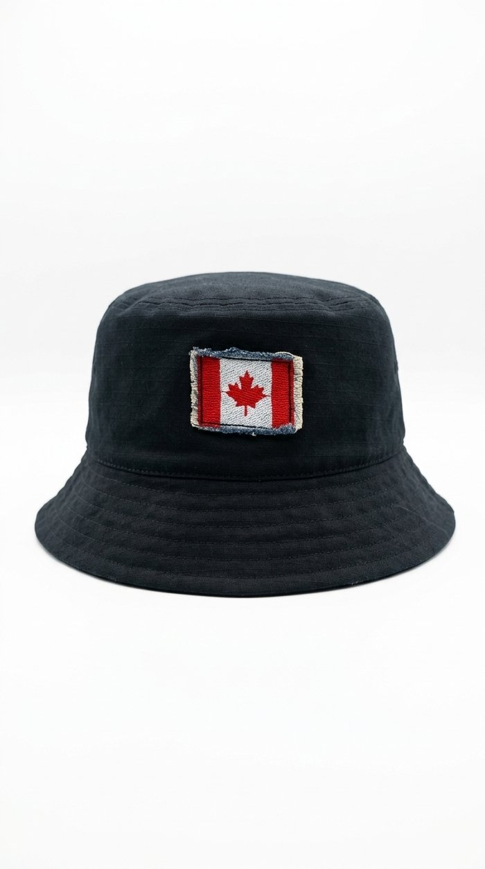 Bucket hat en color negro con parche frontal bordado de la bandera de Canadá. Un accesorio moderno, versátil y fácil de combinar, ideal para quienes buscan un estilo urbano con un detalle distintivo y auténtico.